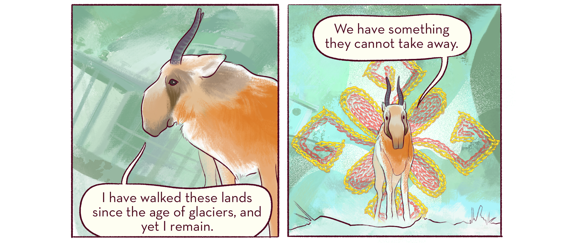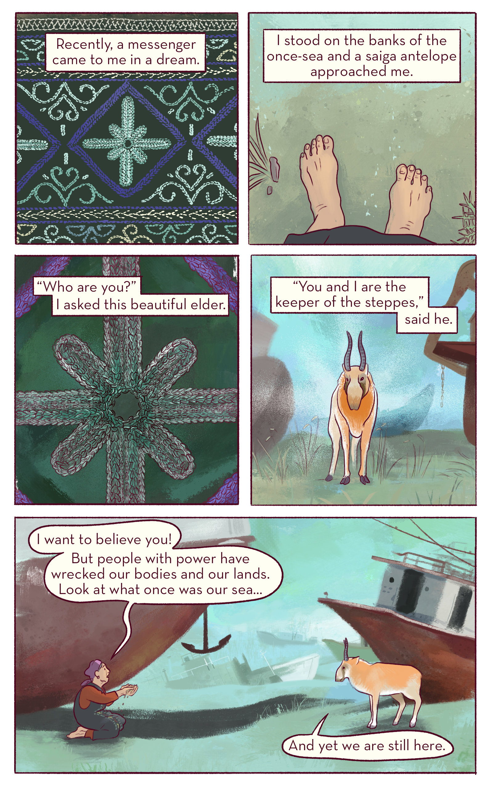 A comic story set in the confluences of russian colonialism, environmental exploitation and creative hope in just ten pages. Funded by NBS Comics and with consultation by Saiga Conservation Alliance. Written, designed and illustrated by myself in Photoshop. 10 pages in English, Russian, and Uzbek.
